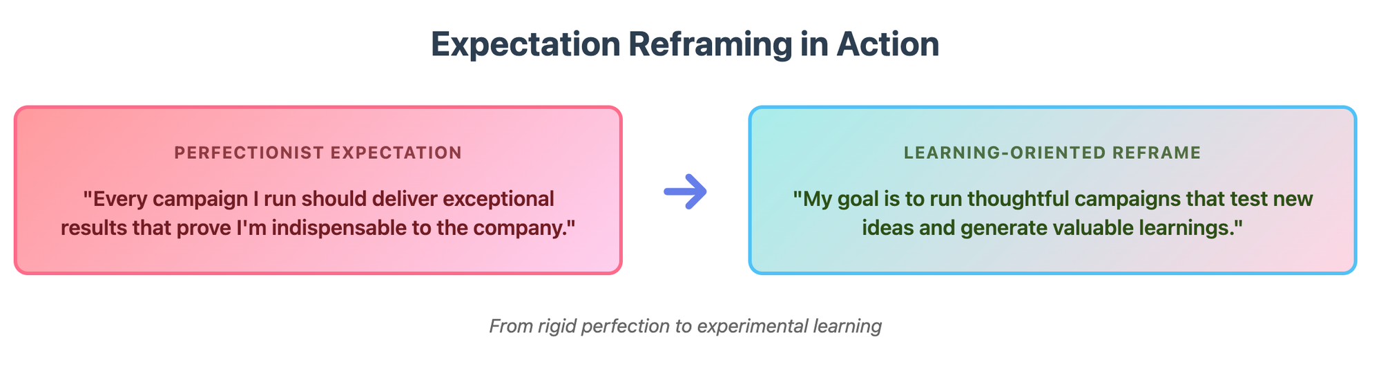 Using cognitive reframing techniques², we rewrote this expectation together: "My goal is to run thoughtful campaigns that test new ideas and generate valuable learnings. Some will succeed dramatically, others will teach us what doesn't work—both outcomes are valuable."