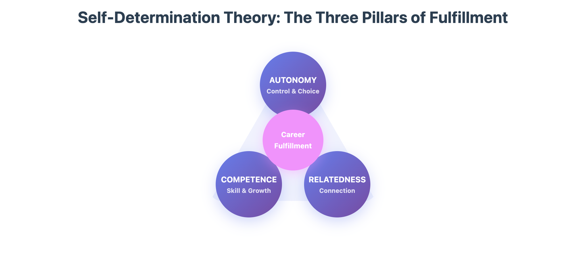 Sustainable career satisfaction doesn't come from external achievements alone. According to Self-Determination Theory⁴, lasting fulfillment arises from satisfying three innate psychological needs: Autonomy (control over your actions), Competence (feeling effective and skilled), and Relatedness (meaningful connection with others).